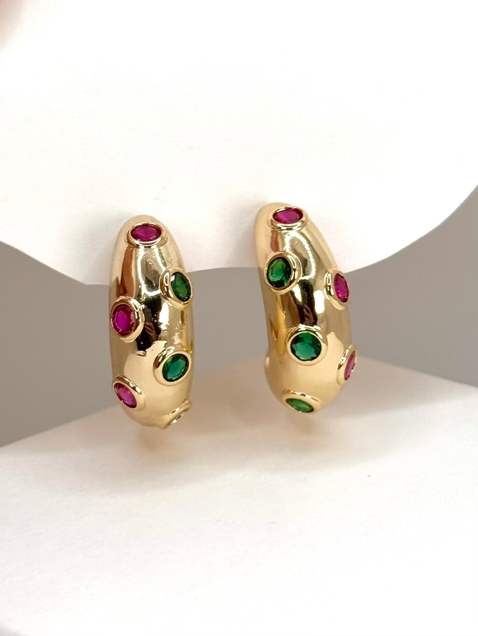 Hoop Earrings 18k Gold Plated Jewelry, the rings with embedded pink and green crystals