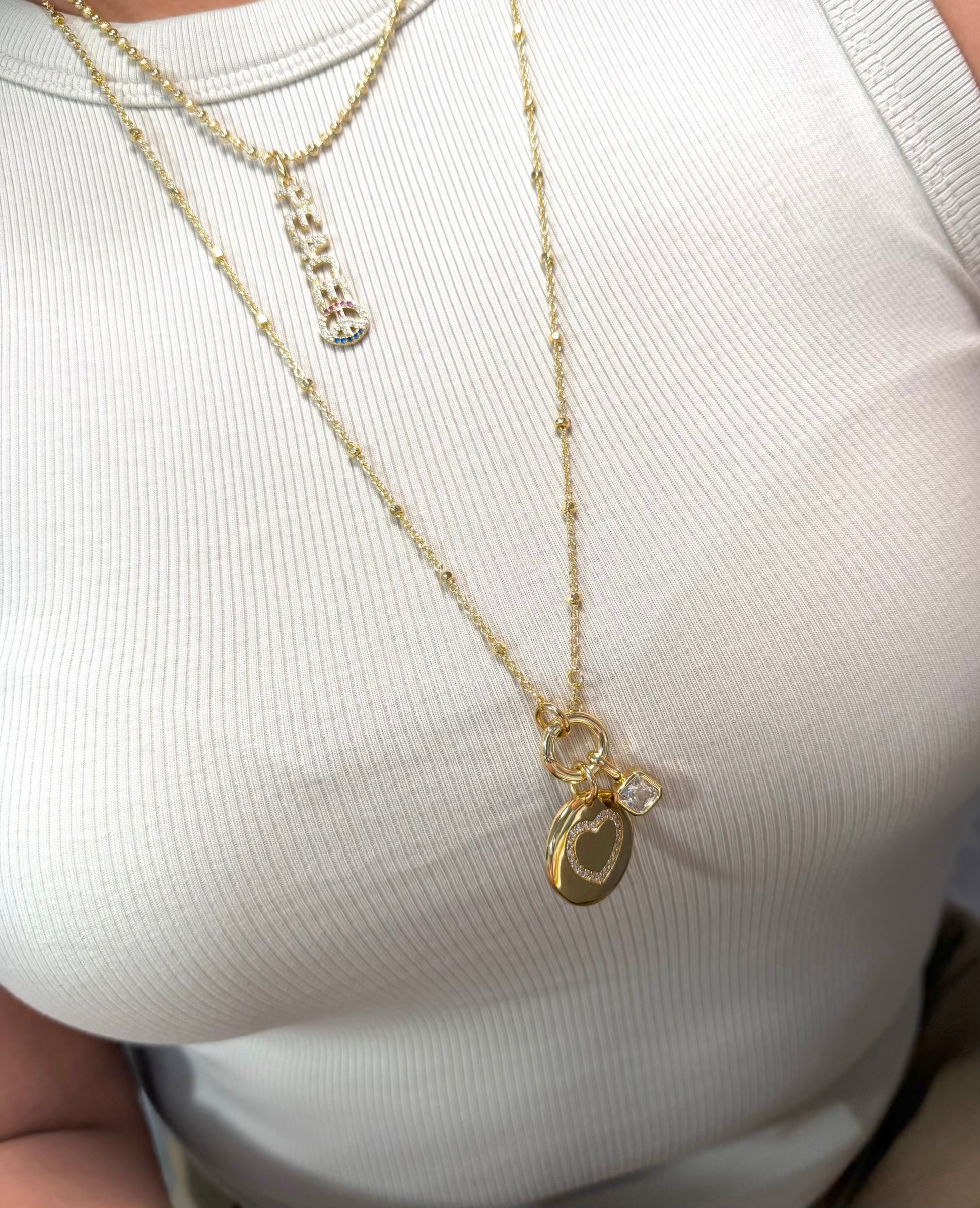 Long 18k gold-plated chain with a heart pendant featuring silver-plated micro cubic zirconia and a white crystal. This chain is fully adjustable. Measures 19 inches with an additional 2 inches.