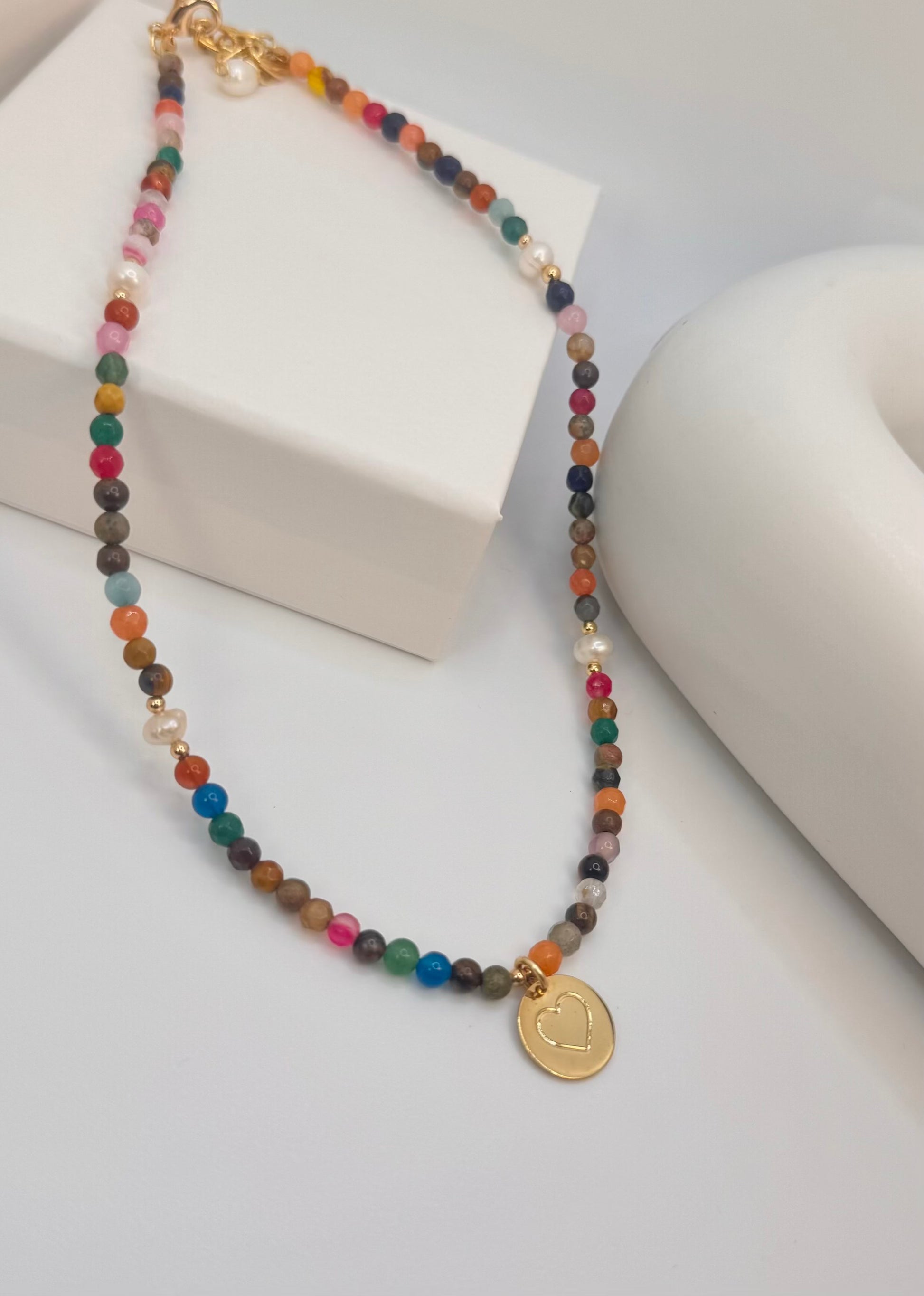 Choker necklace with natural agate and pearl stones and an 18k gold-plated extender.