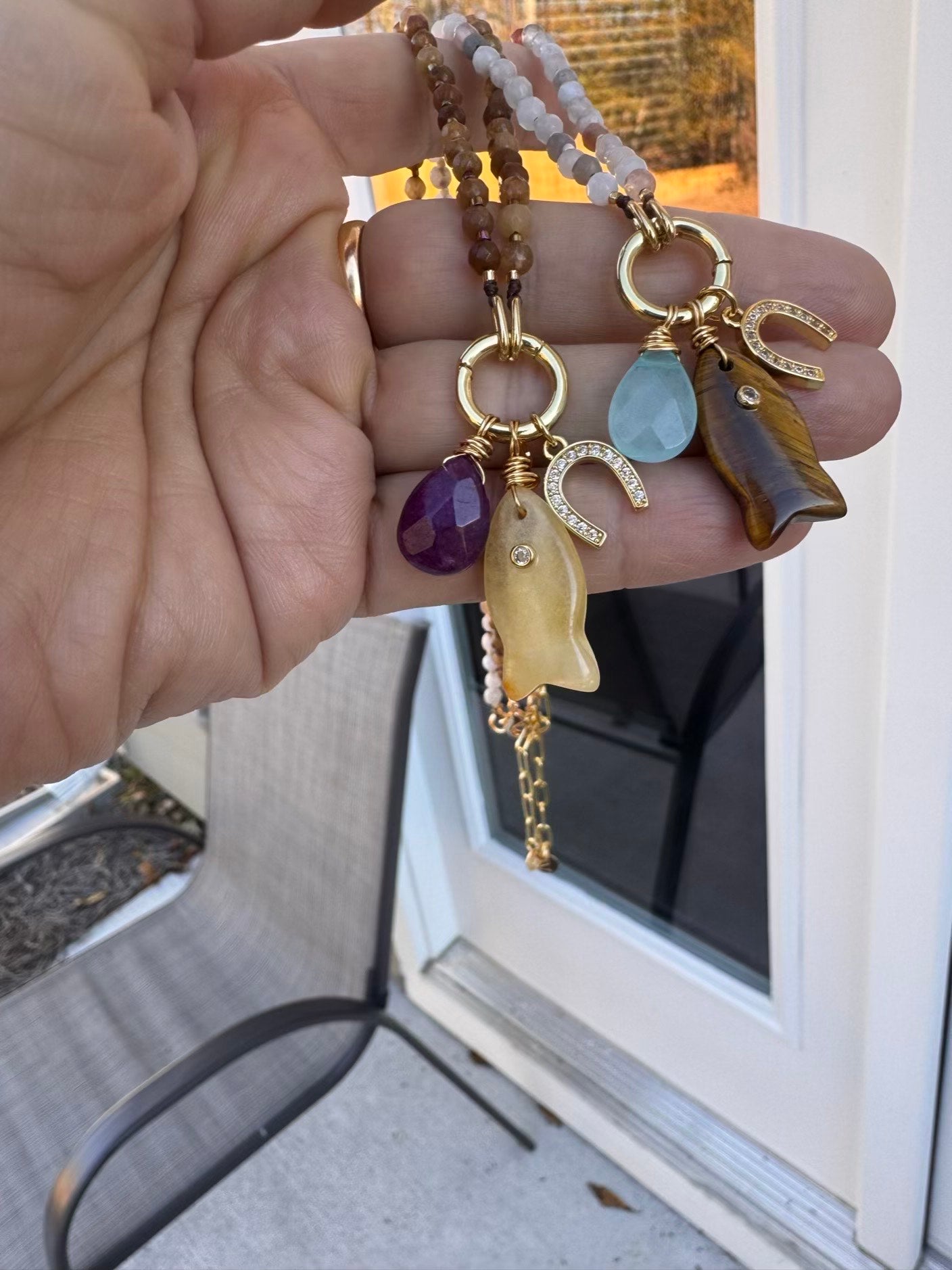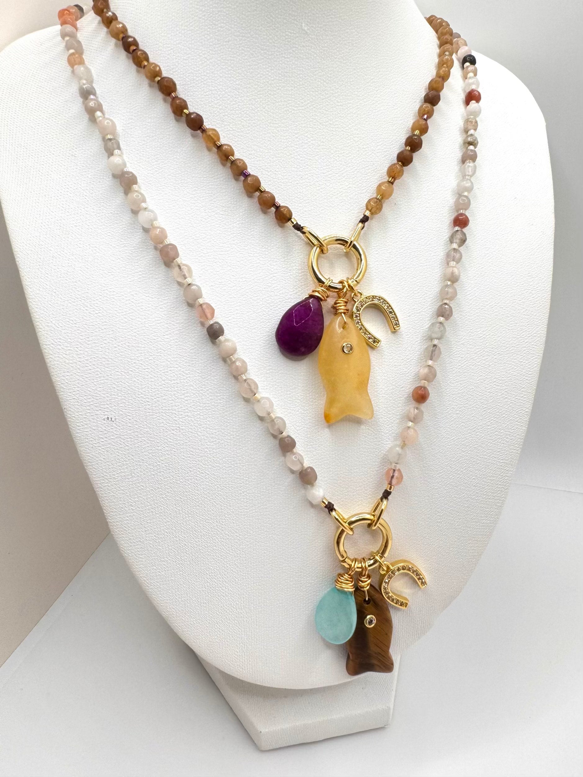 Necklace made with faceted agates and two-tone colored fish and materials of amber-colored quartz and tiger's eye stone. You can choose the color of the fish (yellow or brown)