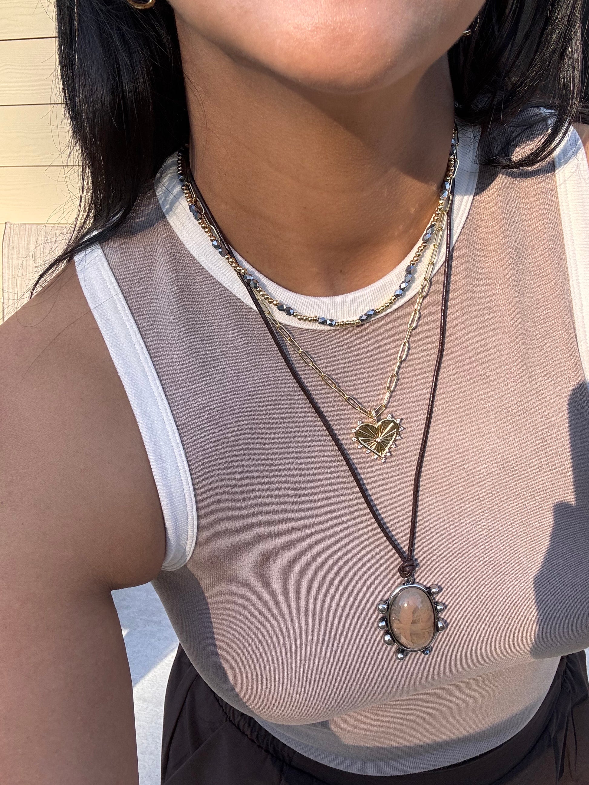 This boho-chic necklace is crafted with a silver-plated pendant and genuine leather cord, making it the perfect accessory for this season. It's adjustable.